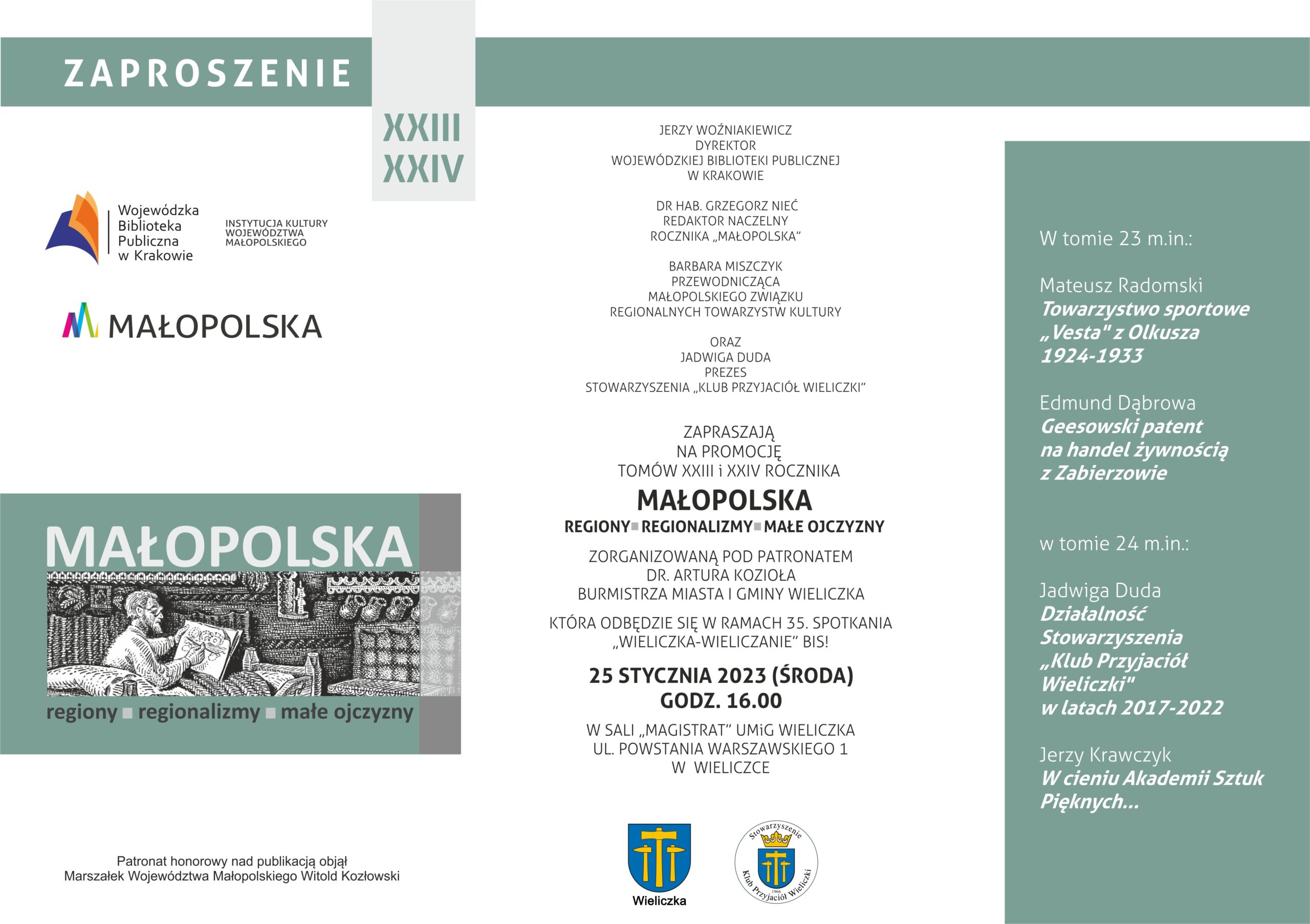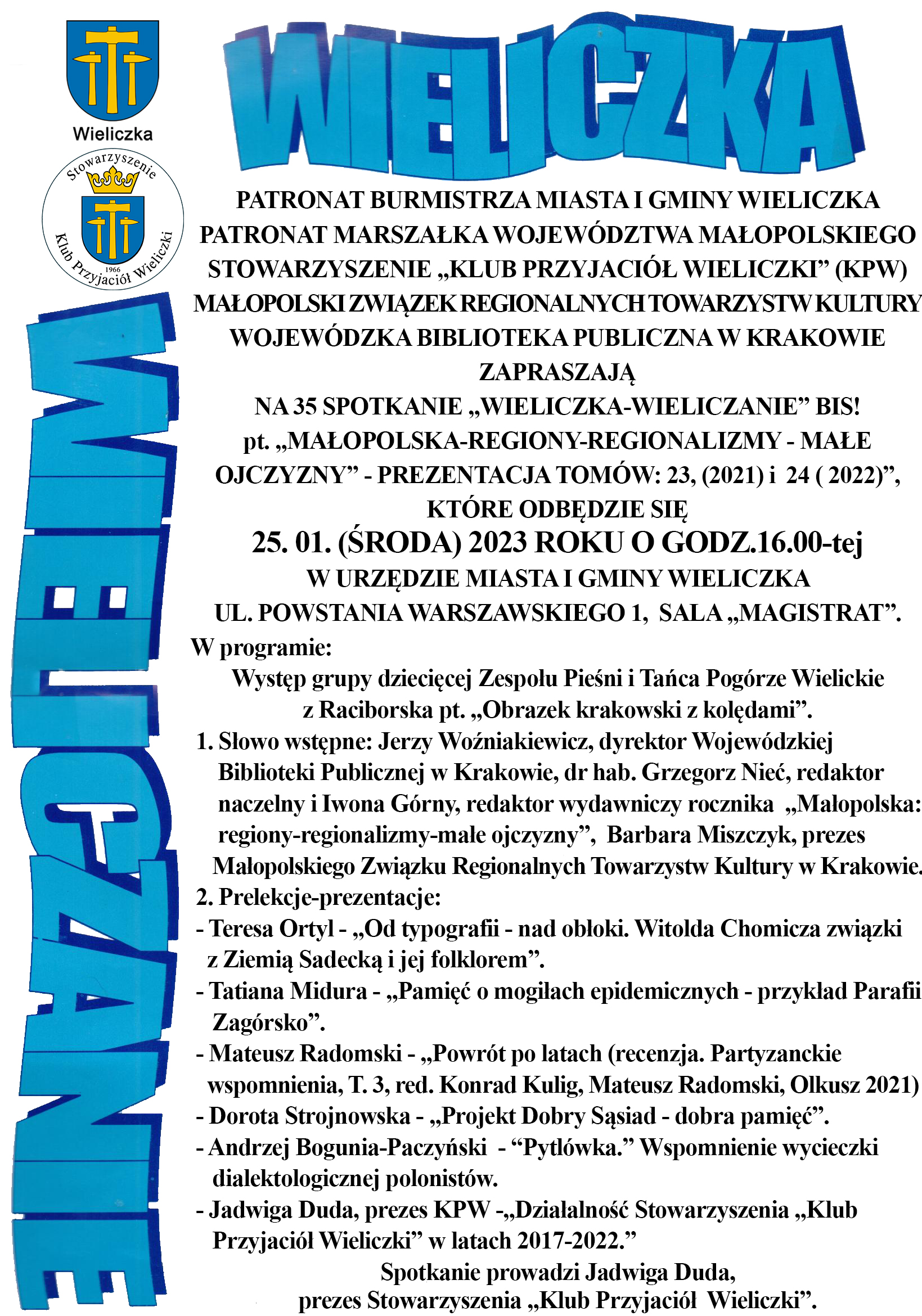 Stowarzyszenie „Klub Przyjaciół Wieliczki” (KPW), zaprasza 25.01. (środa) 2023.r. na godz.16.00-tą na 35 spotkanie z cyklu „Wieliczka-Wieliczanie” Bis! „Rocznik „Małopolska-regiony-regionalizmy-małe ojczyzny” tomy: 23 (2021) i 24 (2022) a w nim m.in. „Działalność Stowarzyszenia „Klub Przyjaciół Wieliczki” w latach 2017-2022”.