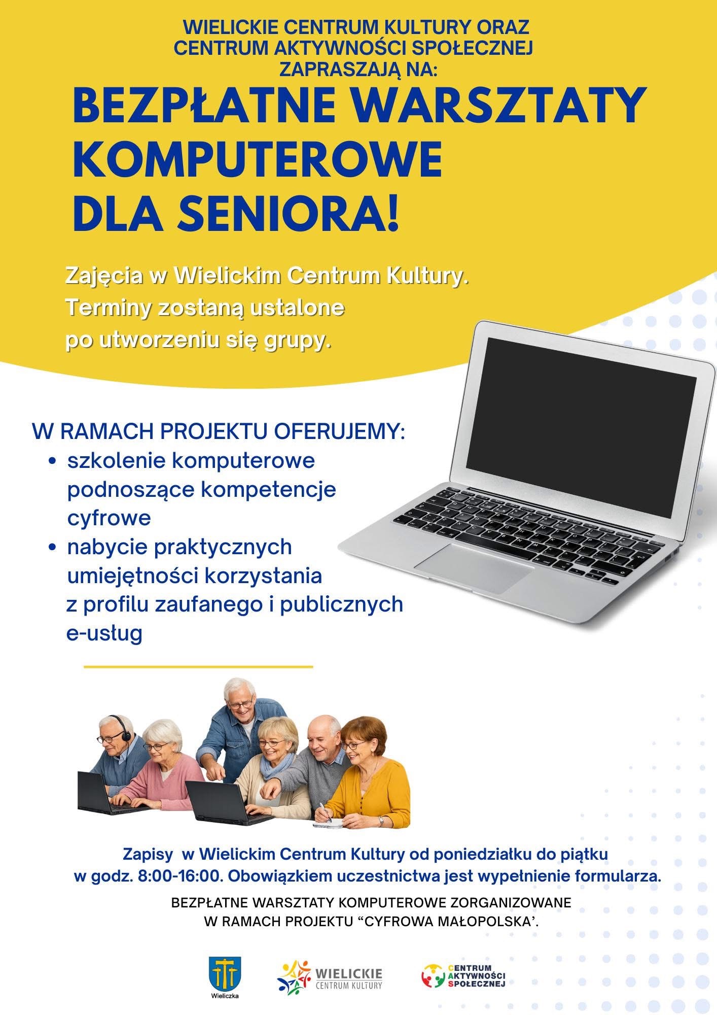 Bezpłatne warsztaty komputerowe dla seniorów : Wielickie Centrum Kulturyoraz Centrum Aktywności Społecznej zapraszają seniorów z terenu Miasto i Gmina Wieliczka do udziału w bezpłatnych warsztatach komputerowych. Zajęcia realizowane są w ramach projektu „Cyfrowa Małopolska” i mają na celu podniesienie...