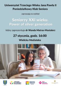 Uniwersytet Trzeciego Wieku im. Jana Pawła II oraz Mediateka – Biblioteka Miejska w Wieliczce serdecznie zapraszają na wyjątkowy wykład: Seniorzy XXI wieku. Power of silver generation,