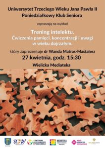 Już za 2 tygodnie – 27 kwietnia – Uniwersytet Trzeciego Wieku im. Jana Pawła II oraz Poniedziałkowy Klub Seniora, wspólnie z Mediateką – Biblioteką Miejską w Wieliczce, zapraszają na wykład: 🧠 „Trening intelektu. Ćwiczenia pamięci, koncentracji i uwagi w wieku dojrzałym”.