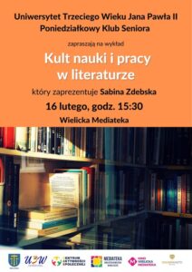 Uniwersytet Trzeciego Wieku im. Jana Pawła II oraz Mediateka – Biblioteka Miejska w Wieliczce zapraszają na wspólny wykład pt. Kult nauki i pracy w literaturze, który zaprezentuje Sabina Zdebska.